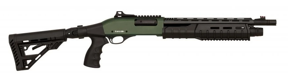 Pokud hledáte pumpovací brokovnici s taktickým vzhledem a teleskopickou a sklopnou pažbou za rozumné peníze, rozhodně nepřehlédněte Francolin Guardian TAX v ráži 12/76. Tato brokovnice má 14" hlaveň a zásobník na 4 náboje. V základu je vybavena světlovodnou muškou a díky liště picatinny ji lze snadno osadit kolimátorem. Robustní předpažbí je z odolného polymeru. Ergonomicky tvarovaná rukojeť zaručuje příjemnou manipulaci.