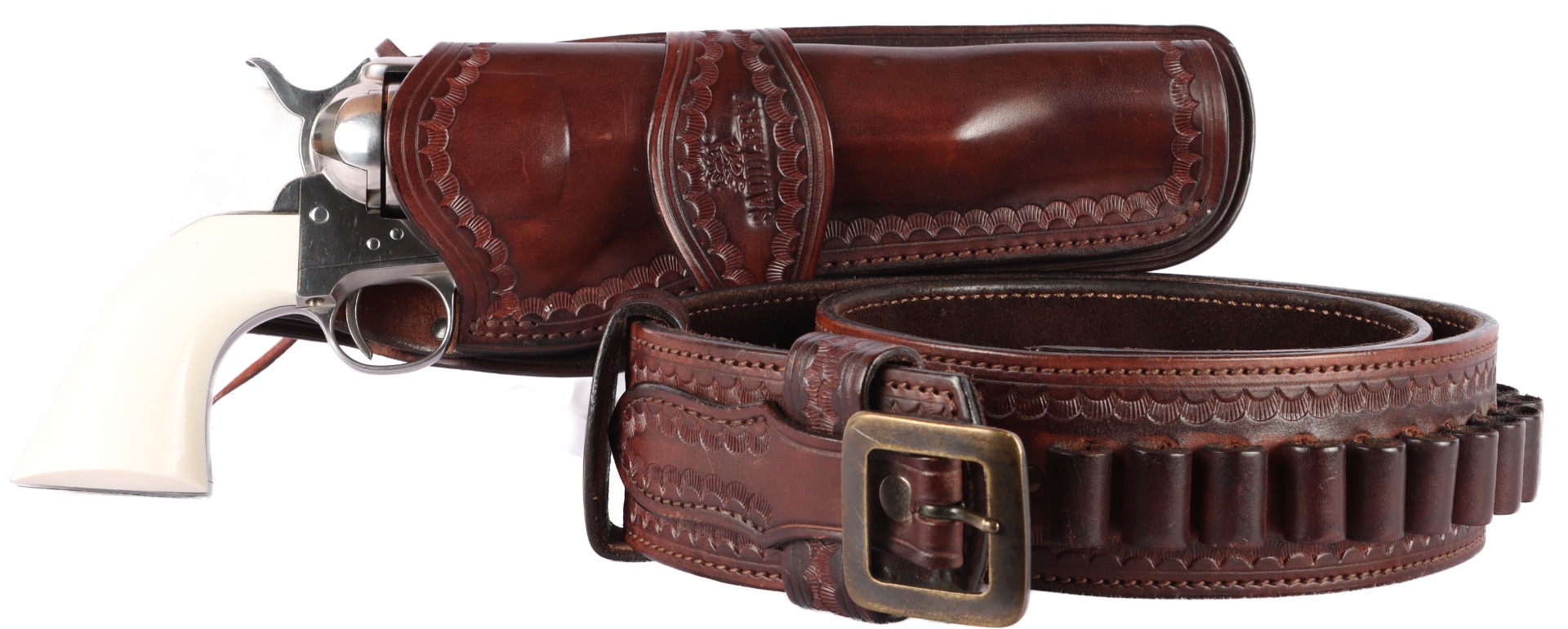 Ke zbrani je 140 kusů střeliva, čištění a na zakázku dělané pouzdro a opasek z kůže.