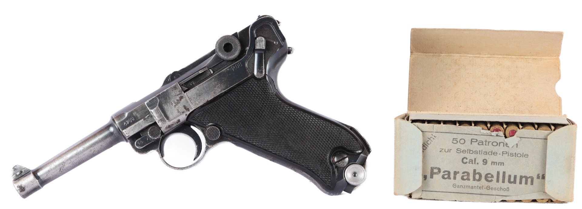 Dva zásobníky, pouzdro a 50 kusů nábojů. Zbraň je označená orlicí.